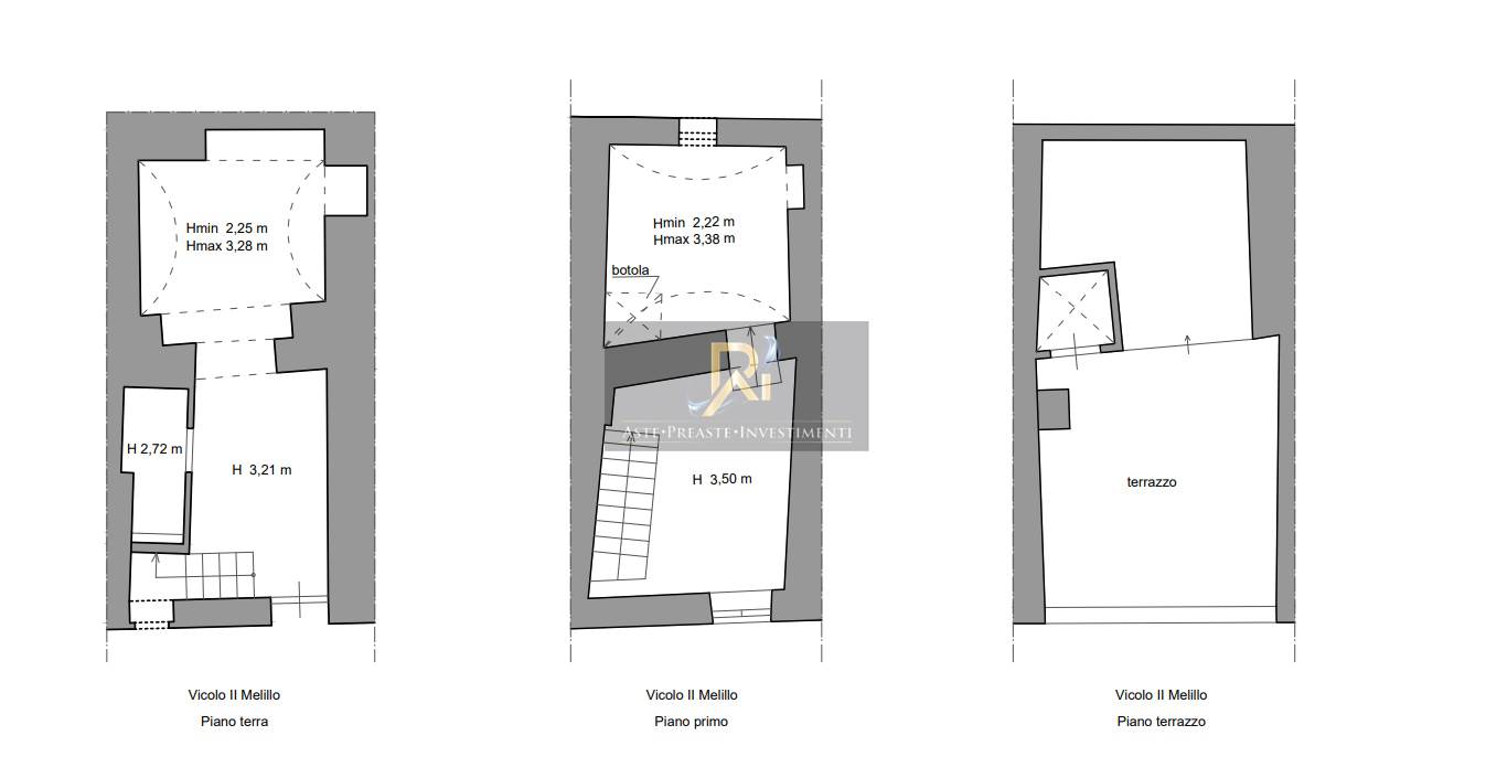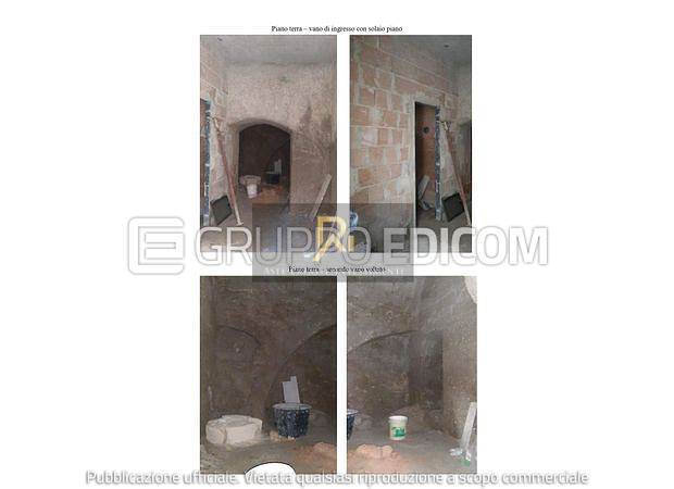 Fabbricato indipendente piano terra, piano primo e piano secondo/lastrico solare. Il piano terra è composto da due vani principali, di cui il primo corrispondente all’ingresso principale dell’immobile, dove è presente un terzo vano più piccolo e cieco e la scala di collegamento al piano primo. Il primo piano è composto da due vani, al primo si accede dalla scala interna dal piano terra, invece nel secondo vano è presente una botola ed una scala in ferro attraverso cui si ha accesso al terrazzo di pertinenza a piano secondo/lastrico solare.