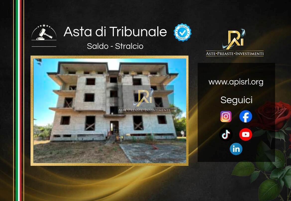 Situato ad Arnara (FR) in Via Borgo Cave snc, all'interno di un contesto prevalentemente residenziale in zona periferica, si propone un intero complesso immobiliare allo stato grezzo con annesso terreno circostante di 2.260 mq. La struttura, distribuita su cinque livelli, si compone di un piano seminterrato che ospita due appartamenti per 113,77 mq, sei depositi per un totale di 27,86 mq e un’area impianti di 98,93 mq. Al piano terra rialzato troviamo tre unità abitative per complessivi 250,29 mq dotate di tre balconi, mentre il primo piano accoglie altri tre appartamenti per 265,53 mq con cinque balconi. Il secondo piano è suddiviso in quattro appartamenti per una superficie di 254,60 mq serviti da cinque balconi, e l’ultimo livello, il terzo piano, è costituito da locali accessori per 242,33 mq arricchiti da quattro balconi per un totale di 52,00 mq di superficie esterna.