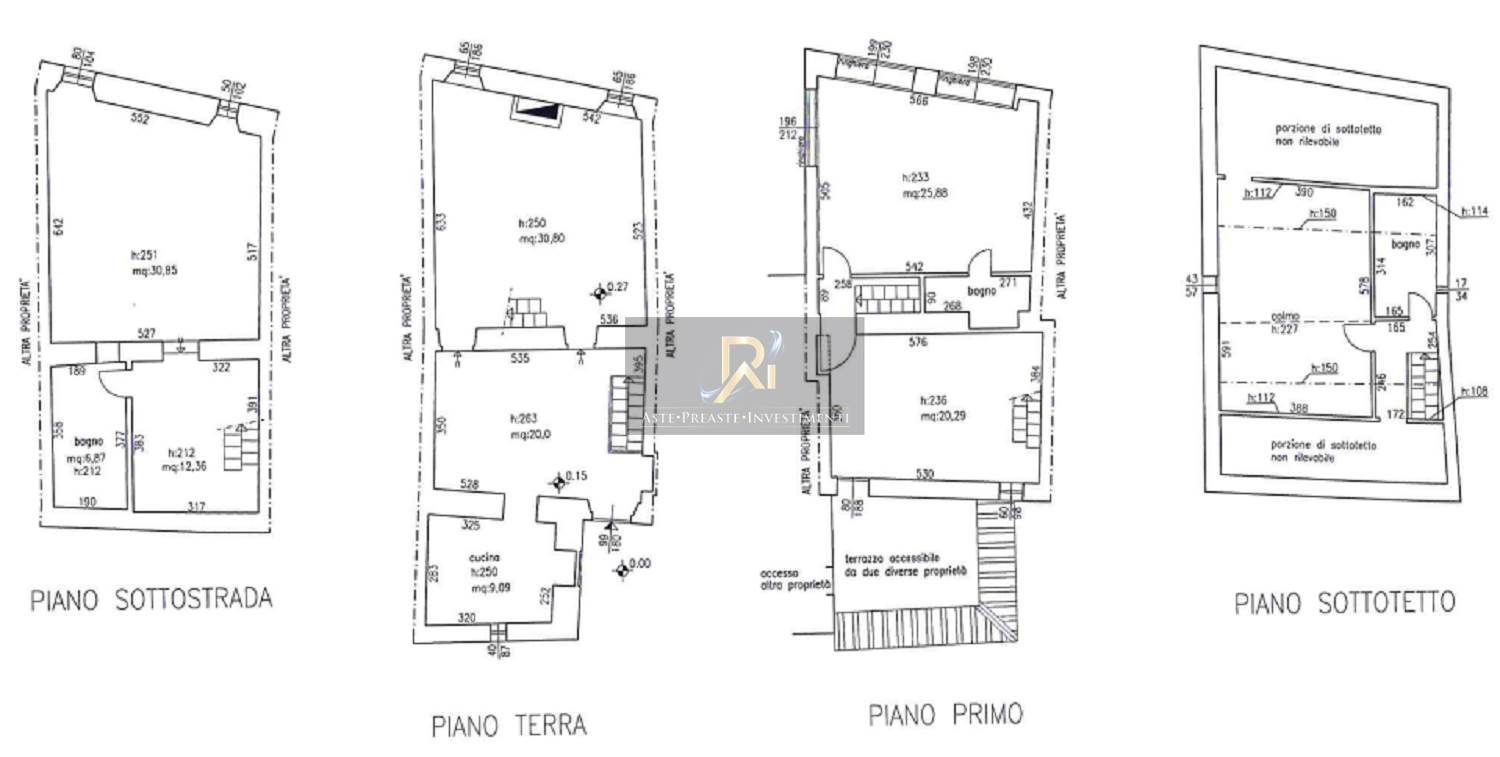 Piena proprietà di appartamento al piano seminterrato, terra, primo e secondo sottotetto di circa 230,88 mq. Consistenza 10 vani. Composto al piano seminterrato da un bagno e due locali, al piano terra da cucina e due locali, al piano primo da un bagno e due locali con terrazza, al piano secondo sottotetto da un bagno, disimpegno e un locale. Il tutto collegato da scala interna.