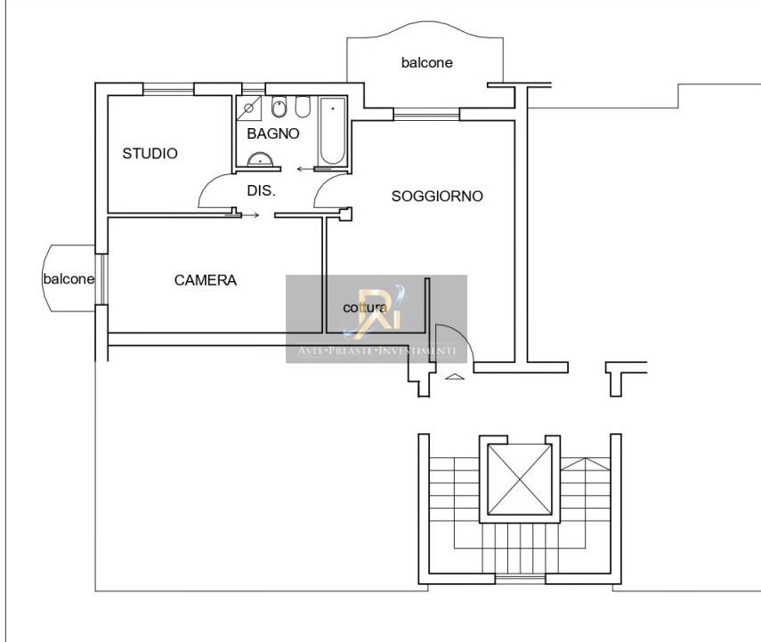 Appartamento ad uso civile abitazione al piano primo, composto di cucina-soggiorno, disimpegno, bagno, camera, studio e due balconi, con cantina al piano interrato.