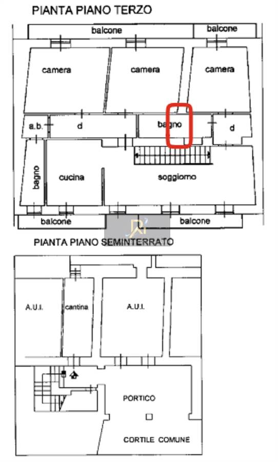Piena proprietà di appartamento al piano terzo di circa 143 mq. Consistenza: 7 vani. Composto da soggiorno/pranzo, cucina, tre camere, due bagni, due disimpegni e balconi, con annesso vano cantina al piano seminterrato e due piccoli terreni di pertinenza.