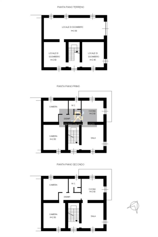 Abitazione su tre piani. Al piano terreno sono presenti tre locali di sgombero. Al piano primo sono presenti due camere, una cucina,una sala, un bagno e un disimpegno. Al piano secondo sono presenti due camere, una cucina, una sala, un bagno e un dismpegno.