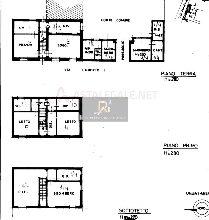 Porzione di fabbricato costituito da abitazione e accessori in contesto di corte con accesso pedonale e carraio fronte strada e dalla corte comune. piano terreno: pranzo, cucina, disimpegno, soggiorno, ripostiglio con servizio, locale di sgombero con accesso dall’esterno. in corpo di fabbrica staccato vano ripostiglio e vani a cantina. piano primo: accesso con scala interna, disimpegno, bagno, due camere, ripostiglio. piano sottotetto: accesso con scala interna, vani di sgombero-ripostiglio.