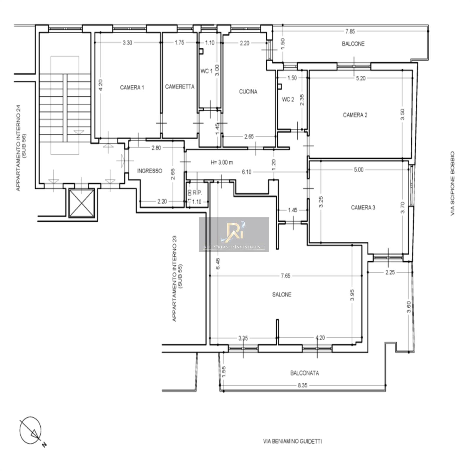 Sito in via Scipione Bobbio n. 13, al piano settimo composto da salone doppio, tre camere, cameretta, cucina, due bagni, ripostiglio e balconi.