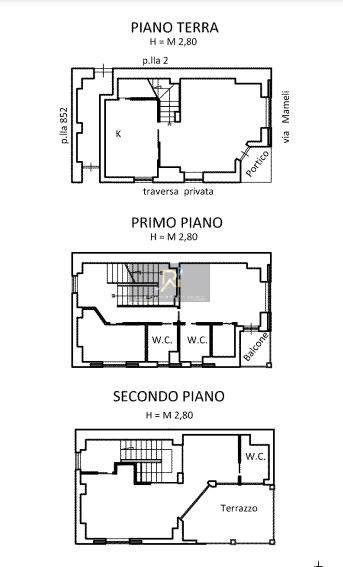 Abitazione su tre livelli composta da: PIANO TERRA - ingresso/salone, n. 1 ambiente, ripostiglio e vano di passaggio. L’accesso al piano terra è garantito dalla porta ubicata, a nord del cespite de quo, su via Mameli; PIANO PRIMO - n. 2 camere, n. 2 w.c, cabina armadio e n. 1 balcone; PIANO SECONDO - salone, cucina, n. 1 w.c. e terrazzo. Il collegamento tra i piani è garantito da una scala interna rivestita in legno.
