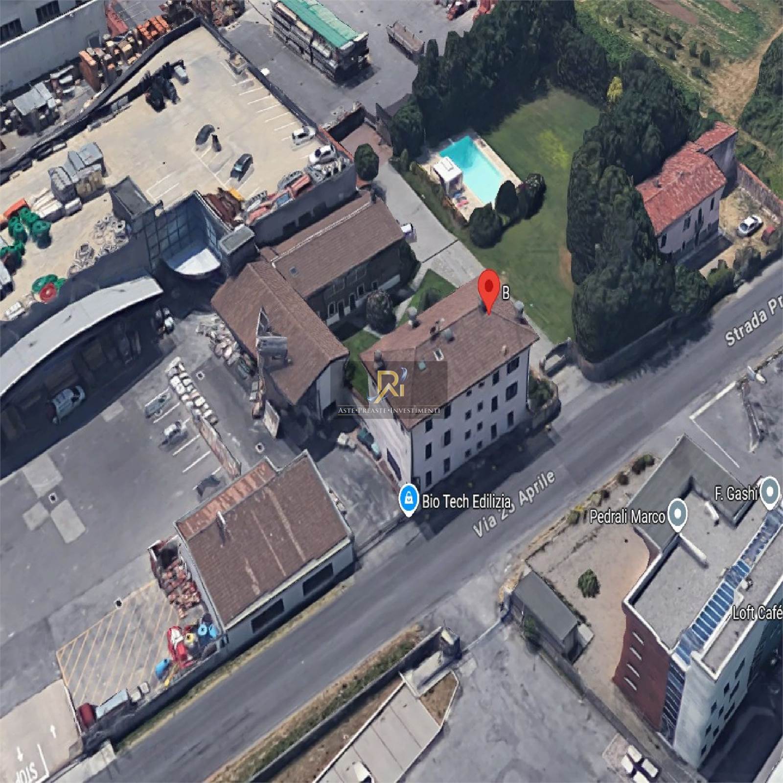 LOTTO B - (COSTITUITO DA LOTTO 2 E LOTTO 3 DEL RAPPORTO DI VALUTAZIONE) LOTTO 2 DEL RAPPORTO DI VALUTAZIONE: TRATTASI DI UNA UNITA' IMMOBILIARE RESIDENZIALE IN EDIFICIO BIFAMILIARE DI TRE PIANI FUORITERRA PIU' PARZIALE INTERRATO, CON ACCESSO UNICO COMUNE ALLE DUE UNITA', DA VIA XXV APRILE. L'UNITA' ABITATIVA OGGETTO DELLA STIMA E' COMPOSTA AL PIANO TERRA DA UN LOCALE APERTO AD USO SOGGIORNO E CUCINA, UN BAGNO CON ANTIBAGNO E IL VANO SCALA; ALL'ESTERNO SI TROVA IL PORTICATO COMUNE CON COLONNE IN PIETRA; AL PIANO PRIMO UN DISIMPEGNO, TRE CAMERE DA LETTO E DUE BAGNI; AL PIANO SECONDO UN LOCALE APERTO AD USO TAVERNA. AL PIANO INTERRATO SI TROVA LA LAVANDERIA E LA CENTRALE TERMICA. ALL'ESTERNO, IN UN EDIFICIO STACCATO, DI DUE PIANI POSTO SUL LATO OPPOSTO DELLA CORTE COMUNE, SI TROVANO UN GRANDE RIPOSTIGLIO AD USO ESCLUSIVO CON ACCESSO INDIPENDENTE DALLA CORTE E DUE LOCALI COMUNI UNO AD USO RIPOSTIGLIO E UNO LOCALE TECNICO.E' PRESENTE UN ASCENSORE INTERNO AD USO COMUNE CON L'UNITA' OVEST.NELL'AREA ESTERNA E' EDIFICATA UNA PISCINA INTERRATA AD USO COMUNE.LOTTO 3 DEL RAPPORTO DI VALUTAZIONE: TRATTASI DI AUTORIMESSA CHE SI TROVA ALL'INTERNO DELLA CORTE DELL'EDIFICIO COSTITUENTE I LOTTI 1 E 2 DEL RAPPORTO DI VALUTAZIONE, CON ACCESSO DA VIA XXV APRILE TRAMITE CANCELLO CARRAIO. L'ACCESSO AVVIENE DA SPAZIO COMUNE AI DUE APPARTAMENTI E NON E' PRESENTE UNA SERVITU' DI PASSAGGIO ALL'UNITA' IN OGGETTO. L' EDIFICIO E' COSTITUITO DA UN PORTICATO APERTO DIVISO DA TRAMEZZE INTERNE A FORMARE DUE POSTI AUTO ED UN LOCALE DI SGOMBERO. SULLA SINISTRA E' PRESENTE UN TAMPONAMENTO CON UNA PORTA CHE CONDUCE TRAMITE UNA SCALA INTERNA AD UN LOCALE INTERRATO.