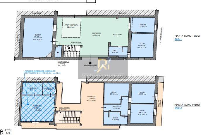 Fabbricato costituito da due Abitazioni piano T-1; è composto, al piano terra (sub 1) da: due cucine, una camera da letto, un w.c., un sottoscala, un’area scoperta con porticato; è composto, al piano primo (sub 2) da: tre camere da letto, un ingresso, un bagno, un terrazzo con scala esterna che consente il collegamento con il piano sottostante, e tre ambienti ancora in corso di costruzione