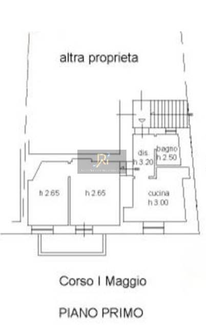Appartamento al primo piano composto da cucina, due camere, bagno e balcone.
