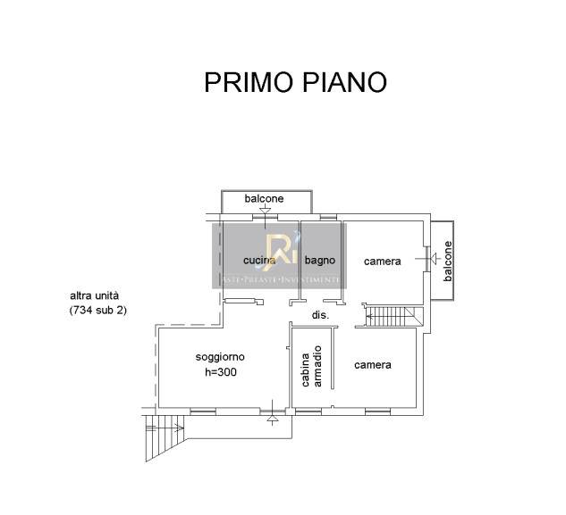 L’unità immobiliare interessata risulta inserita in un unico fabbricato composto da due unità immobiliari ed occupa l’intero piano primo, ad esclusione della scala interna posta a servizio dell’unità al piano terra. E’ un’abitazione con accesso nel soggiorno, attraverso scala e ballatoio esterni, cucina con balcone, disimpegno, bagno, camera con balcone e altra camera con cabina armadio.