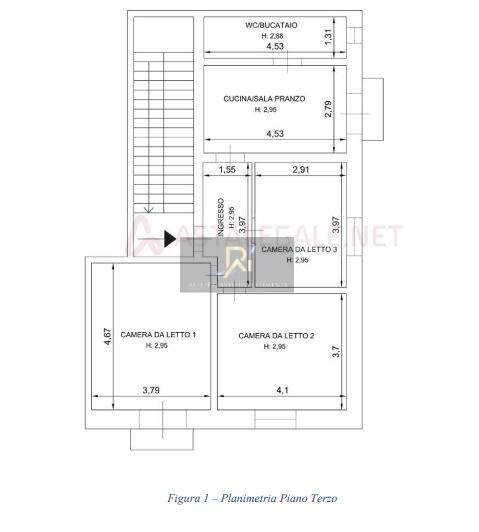 Appartamento al terzo piano composto da ingresso, cucina/sala da pranzo, 3 camere da letto, wc/bucataio, tramezzo ad uso deposito