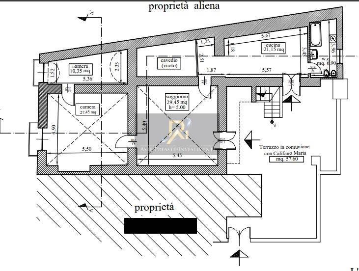 Appartamento sito al piano secondo composto da soggiorno, cucina, due camere e bagno, con i sovrastanti lastrici solari di copertura, antistante terrazzo di accesso.