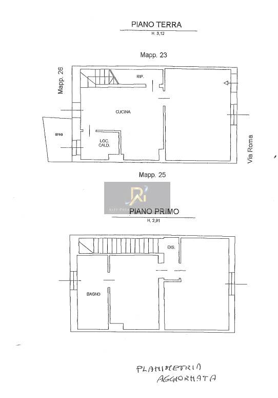 l’unità abitativa, a cortina, si erge di due piani fuori terra ed è composta, entrando da via roma, da ingresso/soggiorno, cucina, ripostiglio/sottoscala, locale caldaia, vano scala ed all’esterno piccola area scoperta. al primo piano, oltre al vano scala, disimpegno, un bagno e due camere.