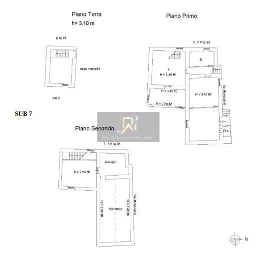 L’unità immobiliare si sviluppa su tre livelli (piano interrato, piano terra e primo) ed è così composta: a) quattro vani al piano terra e due servizi igienici (vi si accede tramite due ingressi ai civici n.8 e n. 10 da via Monticello III; b) stanza, terrazzo scoperto e locale sottotetto accessibile al primo piano; c) tre locali deposito (di cui uno utilizzato come locale tecnico con caldaia, forno a legna e tubazioni varie) al piano interrato (piano terra rispetto al Largo Monticelli).