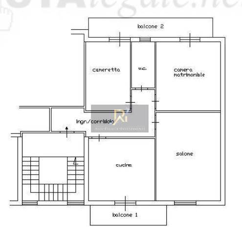 Appartamento al piano primo composto da soggiorno, cucina, due camere, bagno e due balconi.