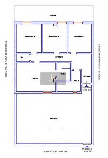 Appartamento al piano primo composto da cucina, tre camere, due bagni, ripostiglio e terrazza.
