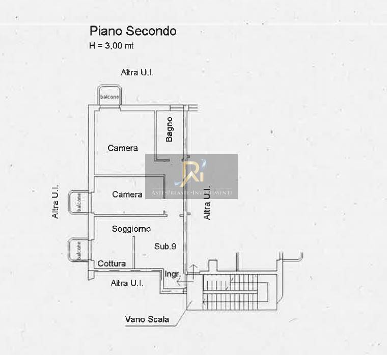 Appartamento al piano secondo, composto da ingresso, soggiorno con cucina a vista, due camere, bagno e tre balconi, ripostiglio al piano primo interrato.