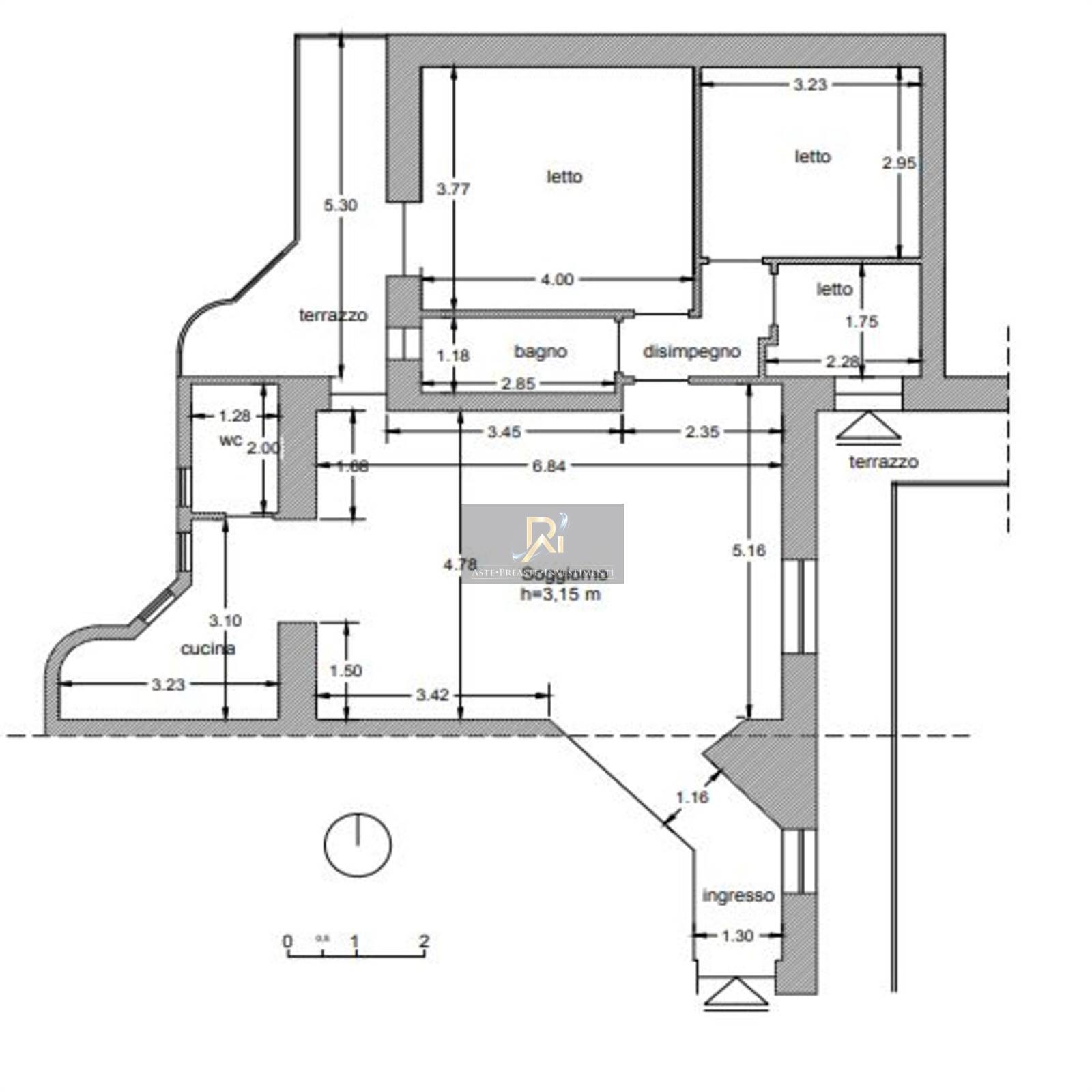 Appartamento al primo piano composto da un soggiorno/ingresso con cucinino ricavato sul balcone, tre vani, due wc, un disimpegno oltre a un terrazzo.