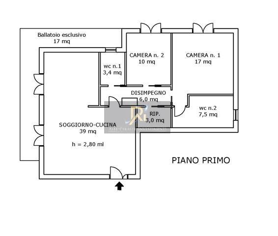 Appartamento al piano primo, composto da soggiorno/cucina, due camere da letto, due wc oltre al disimpegno e un piccolo vano ad uso ripostiglio; fruisce di un balcone esclusivo.