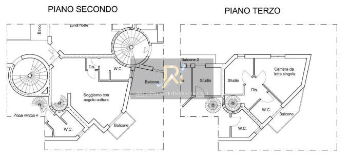 Appartamento al piano secondo e al piano terzo mansardato, composto al piano secondo da soggiorno con angolo cottura, disimpegno e bagno. Al piano terzo sono ubicati una camera da letto, uno studio, disimpegno e bagno. Il tutto è collegato da scala interna a chiocciola.