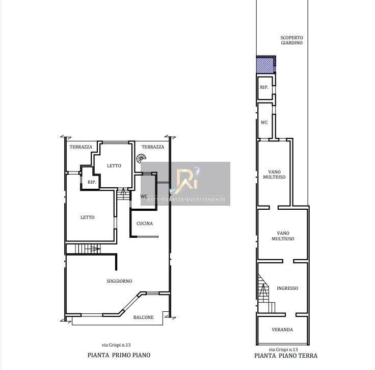 Appartamento al piano terra e primo composto da veranda antistante, vano ingresso, due vani multiuso, WC e ripostiglio. Il primo piano è costituito da ampio soggiorno-salotto, due camere da letto, cucina, ripostiglio, corridoio, bagno, due terrazze retrostanti e un balcone antistante che affaccia sulla via pubblica.