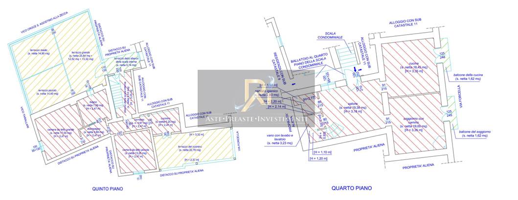 Appartamento posto al quarto piano della scala unica, distinto dal numero interno undici, originariamente composto da due vani ed accessori, con annesso piccolo stanzino ubicato al quinto piano, della superficie catastale totale di 95,00 mq. È composto, al quarto piano, da una superficie di 62,86 mq con salone, bagno, vano lavanderia, soggiorno con camino, cucina e balconi. Al 5° piano, su una superficie di 58,29 mq, sono presenti corridoio, disimpegno, bagno, due camere, cucinino e terrazzi.
