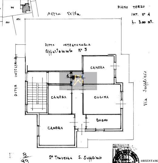 Appartamento al piano terzo composto da ampia zona destinata ad ingresso/living, due bagni, disimpegno, n. 2 camere e ripostiglio. In continuità con l’appartamento vi è un’ampia balconata.